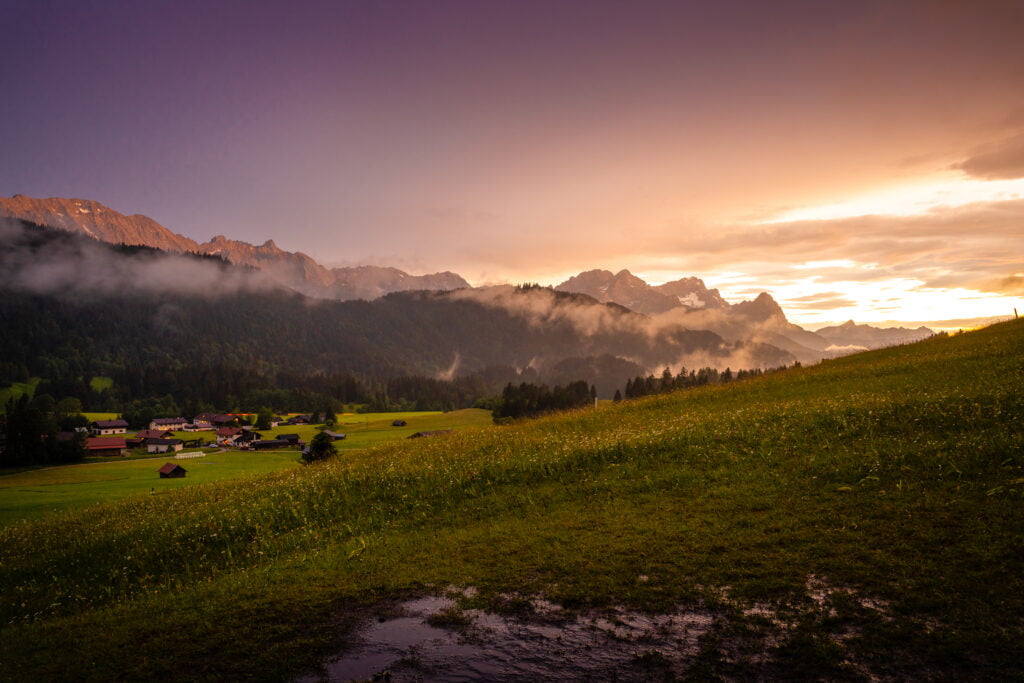 After catching my breath again I realised how lucky i got, because five minutes later the rainbow was gone and the light was different again. The fields were wet, the air was humid but standing there and having witnessed this special moment was unbelievable. As it got dark soon my girlfriend and I, she also arrived on the little hill just in time to see the rainbow, headed back to the car. We drove back to Seefeld to catch some sleep. Before going to bed I checked the weather for the next morning, because i also wanted to get a photo at sunrise of this stunning location. It looked quite promising so I set the alarm at 4:00am in the morning and went to sleep.